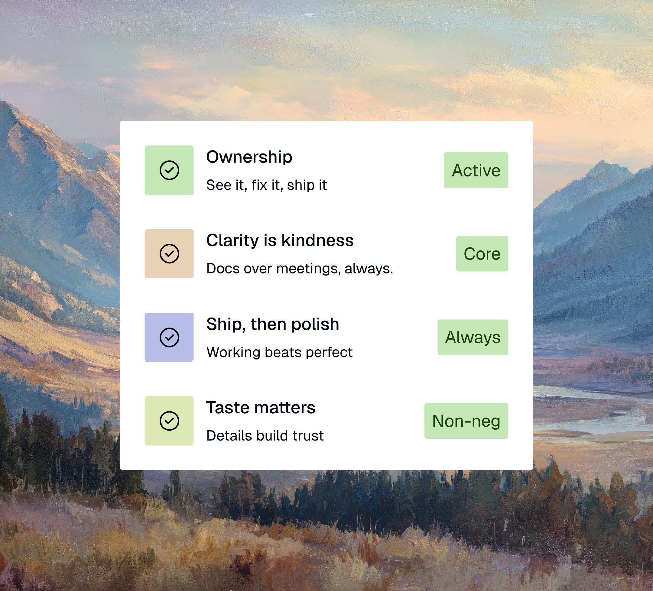 See a problem? Fix it. You don't need a ticket or a meeting. We trust each other to make good calls and course-correct openly when needed.